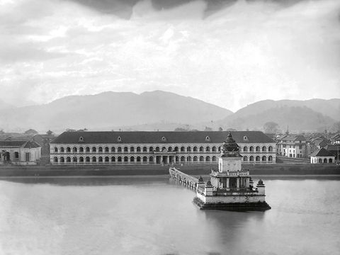 View of old Kathmandu including the temples in Kathmandu Durbar Square as seen from the Bhimsen Tower. The old horse stables in the centre have been replaced by modern buildings, presently New Road. ©Kiran Man Chitrakar Collection. Dirgha Man Chitrakar, 1900s.